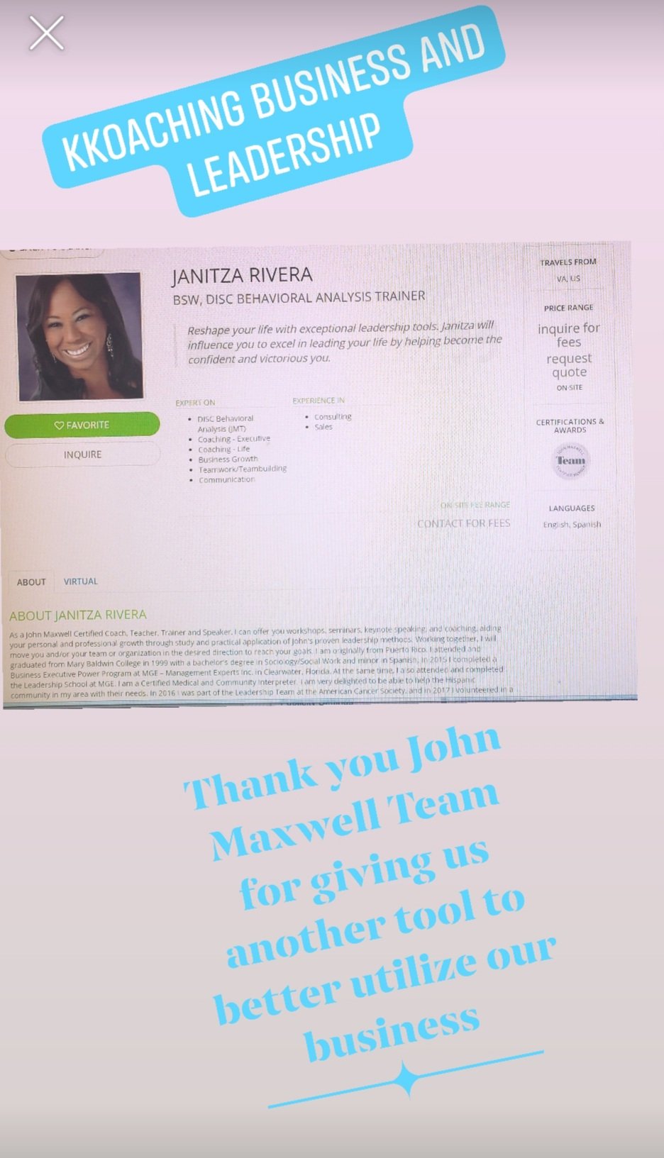 As a John Maxwell Certified Coach, Teacher, Trainer and Speaker, I can offer you workshops, seminars, keynote speaking, and coaching, aiding your personal and professional growth through study and practical application of John’s proven leadership methods. Working together, I will move you and/or your team or organization in the desired direction to reach your goals. I am originally from Puerto Rico. I attended and graduated from Mary Baldwin College in 1999 with a bachelor’s degree in Sociology/Social Work and minor in Spanish. In 2015 I completed a Business Executive Power Program at MGE – Management Experts Inc. in Clearwater, Florida. At the same time, I also attended and completed the Leadership School at MGE. I am a Certified Medical and Community Interpreter. I am very delighted to be able to help the Hispanic community in my area with their needs. In 2016 I was part of the Leadership Team at the American Cancer Society, and in 2017 I volunteered in a dental clinic in Haiti. I have been in the dental field for over twenty years. Educating our patients is very important to me as well as training our team. I love educating myself about leadership. In 2016 and 2017, I was chosen as Miss Virginia Woman of Achievement. Contact Me. I am looking forward to assisting you on your journey to becoming a successful leader. Janitza Rivera View all posts by Kkoaching Business And Leadership